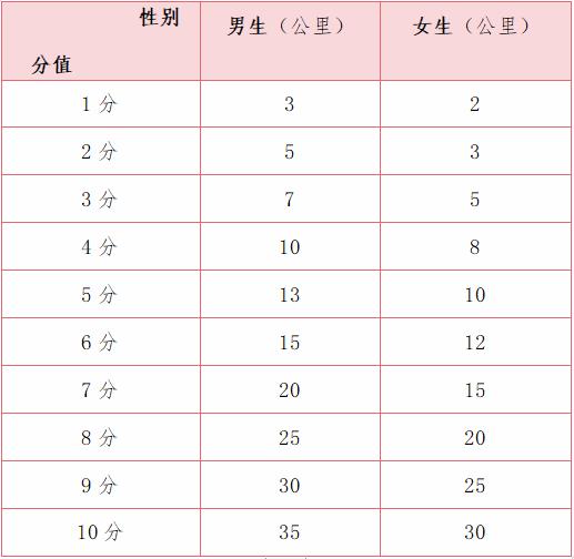在1-10分值区间内,根据学生完成里程数对应分数进行评定,男生低于3公里/学期,女生低于2公里/学期,课外锻炼成绩记0分。